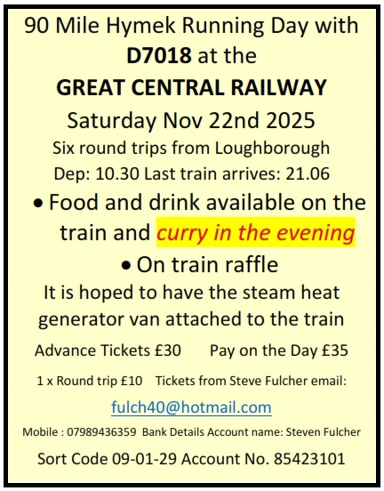 D7018 is staying at the GCR until the end of April 2026 and this will provide several opportunities for ‘Hymek’ haulage, as below: