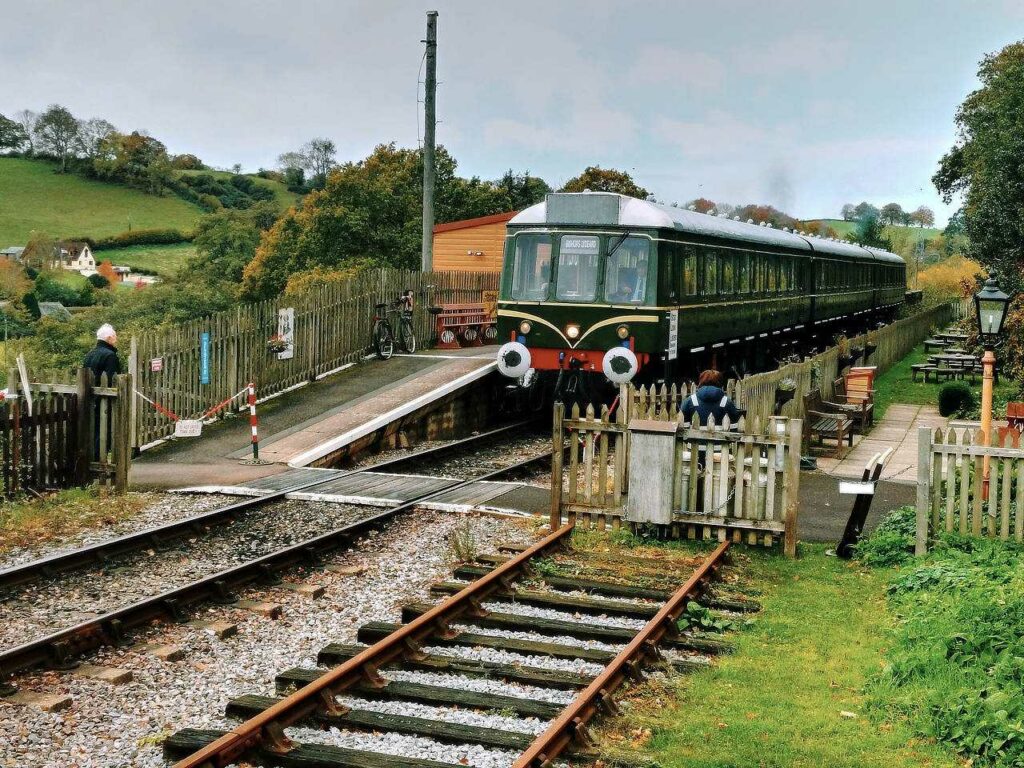 Pictured departing from Stogumber on the climb to Crowcombe Heathfield, the WSR’s Class 115 Diesel Multiple Unit (DMU) was in use supporting the steam services during half-term week. Pictured on Thursday 30th October 2025 by Steve Lewis © CC BY-NC 4.0