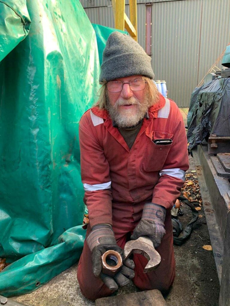 D1010 – the 2″ BSW nuts put up a fight, but patience and the appliance of science won the day. Colin F was pictured with his 70mm spanner and one of the troublesome nuts at Williton on Saturday 25th October 2025. Photo by Andy Royal © CC BY-NC 4.0