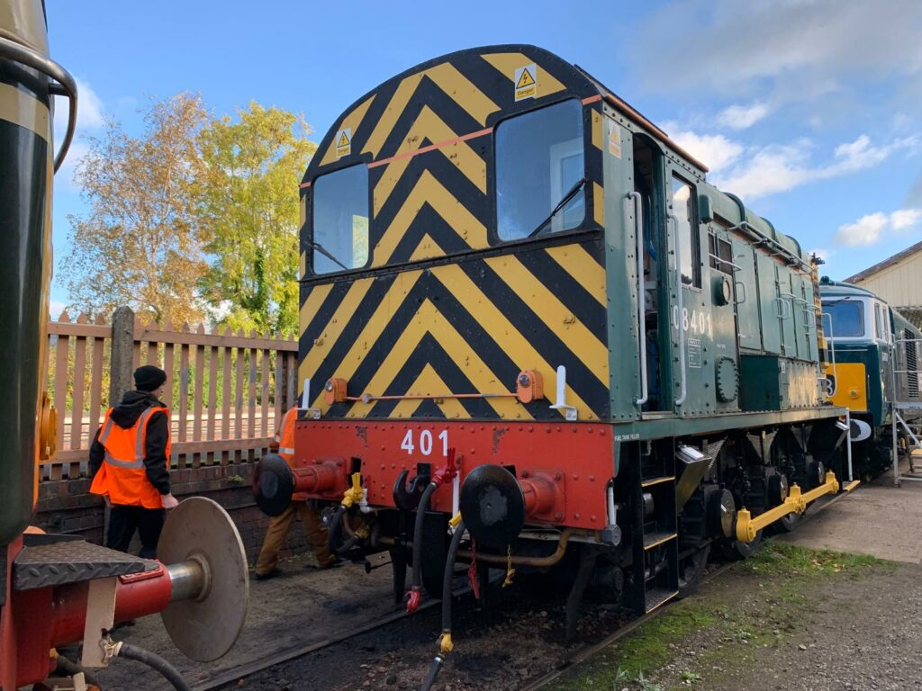 08401 (D3516) – this loco has been moved onto No 1 road at Williton and is now stabled between Class 33 ‘Crompton’ D6566 (33048) on the left and Class 35 ‘Hymek’ D7017 on the right. Pictured while undergoing inspection on Saturday 25th October 2025 by Andy Royal © CC BY-NC 4.0