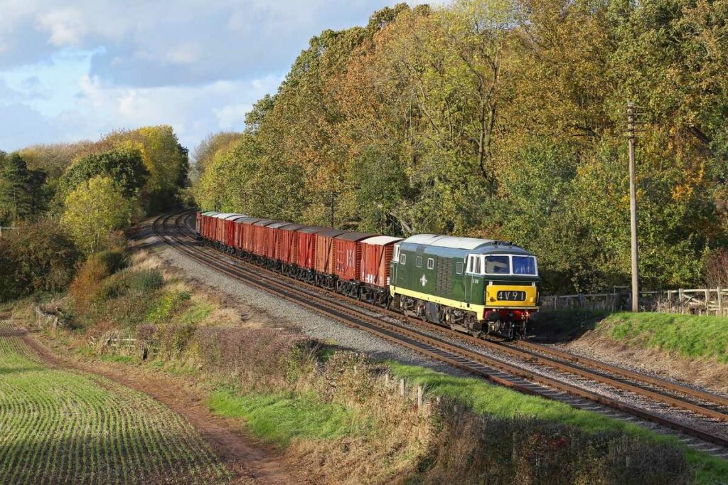 Class 35 ‘Hymek’ D7018 made a fine picture as she lifted a train of vans out of Swithland Sidings on the Great Central Railway on Tuesday 28th October 2025. The full day of goods train workings using D7018 was arranged as a photo charter by David Williams and Timeline Events. Photo by Andrew Royle © CC BY-NC 4.0