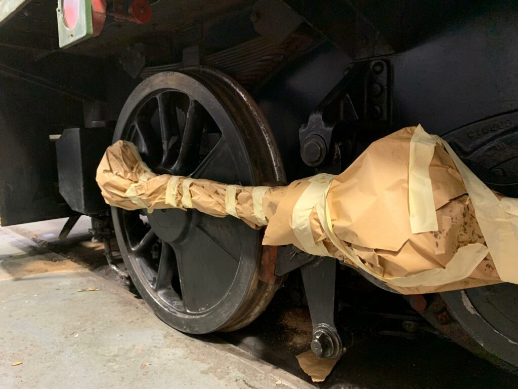 D9526 – this side rods were wrapped in masking paper and tape to ensure that they do not get contaminated by the over-spray. Pictured at Williton on Saturday 25th October 2025 by Andy Royal © CC BY-NC 4.0