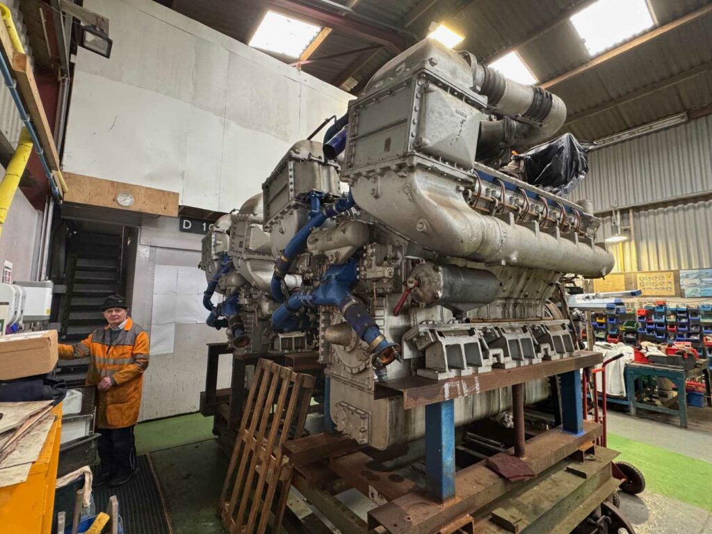 D1010 – the two stored Bristol Siddeley Maybach MD655 engines from D1010 dominate the corner of the shed at Williton. Pictured along with John C on Saturday 8th March 2025 by Jon Tooke © CC BY-NC 4.0
