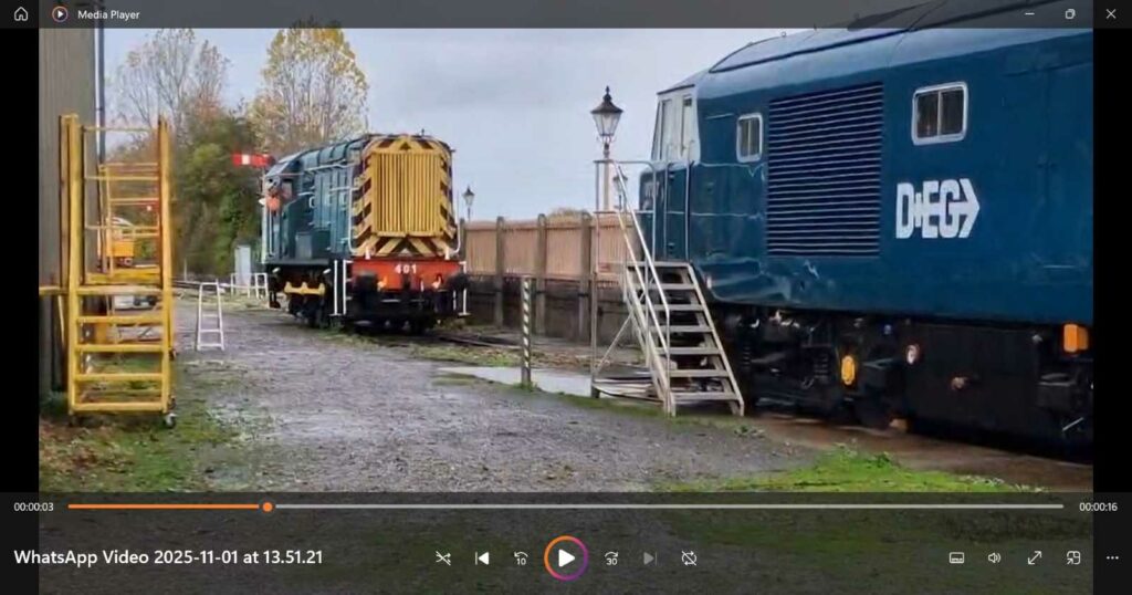 08401 (D3516) – this loco was operated under her own power on No 1 road at Williton on 1st November 2025 and shuttled between Class 33 ‘Crompton’ D6566 (33048) on the left and Class 35 ‘Hymek’ D7017 on the right. Click here or on the image above to view this video clip by Martin Howard © CC BY-NC 4.0