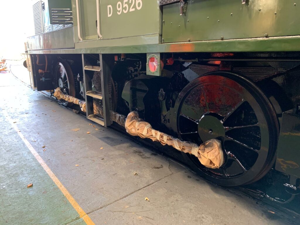 D9526 – now sporting a nice shiny coat of black paint, the underframe of the loco is looking very smart again. The side rods were wrapped in masking paper and tape to ensure that they did not get contaminated by the over-spray. Pictured at Williton on Saturday 1st November 2025 by Andy Royal © CC BY-NC 4.0