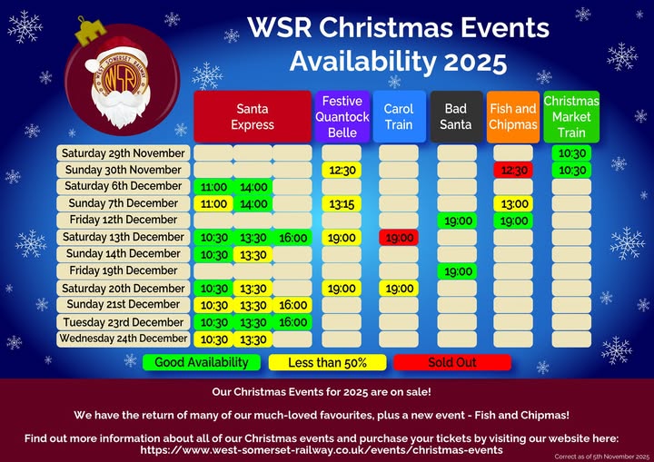 Dare it be mentioned, but the Christmas Specials will be starting on Saturday 29th November, the kick-off being the MINEHEAD STATION CHRISTMAS MARKET SPECIAL that departs from Bishops Lydeard at 10:30 on Saturday 29th and Sunday 30th, returning from Minehead at 15:00 each day. The handy graphic below has been borrowed from the WSR’s Facebook page, but gives a quick indication of what is on offer: