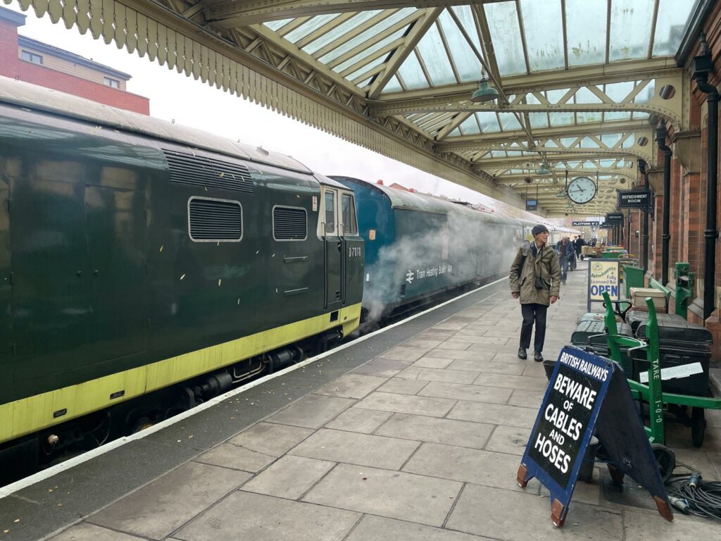 Class 35 ‘Hymek’ D7018 was pictured at Loughborough Central Station on Saturday 15h November 2025 with the GCR’s Train Heating Boiler Van coupled behind and evidently steaming nicely. This scene will be repeated on Saturday 22nd November and the steam heat will be even more appreciated. Photo by Paul Tucker © CC BY-NC 4.0