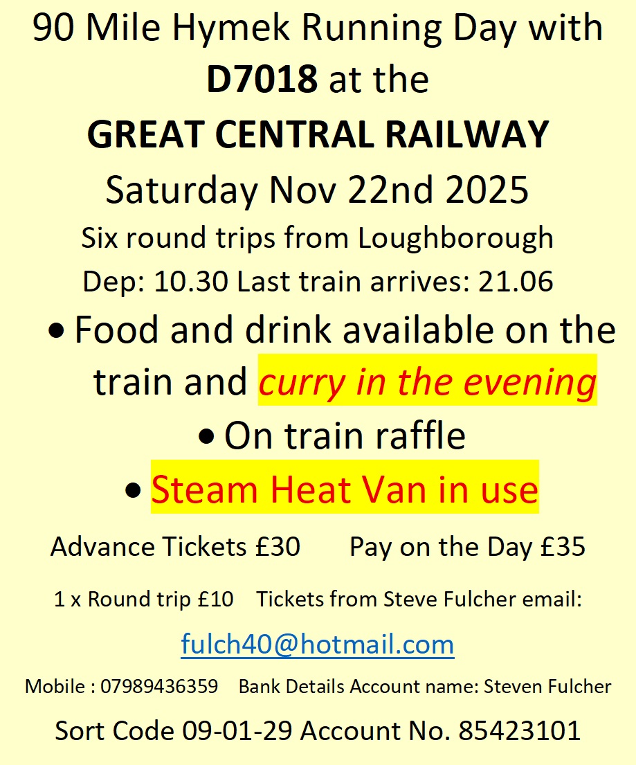 On the Great Central Railway, Class 35 ‘Hymek’ D7018 will be working the ‘Steve Fulcher Charter‘ for which tickets are still available by contacting Steve directly – CLICK HERE to get more details. DEPG member and diesel-hydraulic enthusiast Steve has carried the financial risk of chartering D7018 while she is based at the Leicestershire line and has arranged for the steam heating van and the griddle car to be included in the consist, which will then make SIX round trips of the line, starting at 1030 and completing the final leg at 21:06 (it is not mandatory to do all six trips!). WELL DONE STEVE for making the most of D7018 while she is away from her normal home base.
