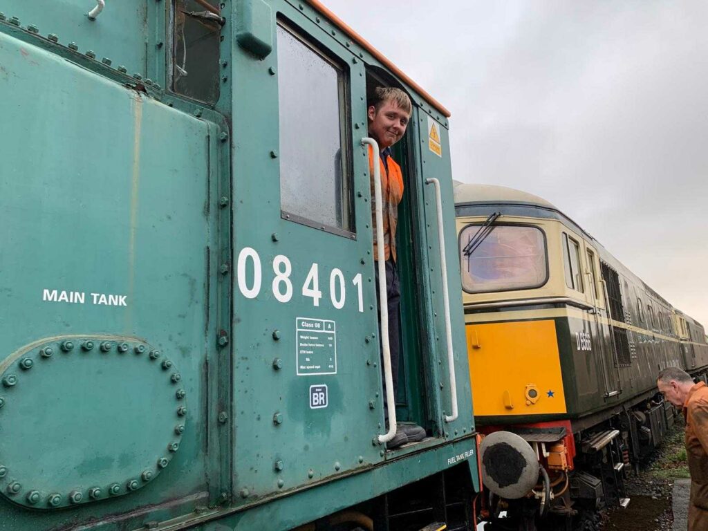 08401 (D3516) – it seems that another of our new volunteers has migrated towards Ian’s team – Ethan W was spotted on board our newest acquisition at Williton on Saturday 15th November 2025. In the loco lineup on No. 1 road are Class 33 ‘Cromptons’ D6566 (33048) and D6575 (33057) – plus a cameo appearance by Ian ! Photo by Andy Royal © CC BY-NC 4.0