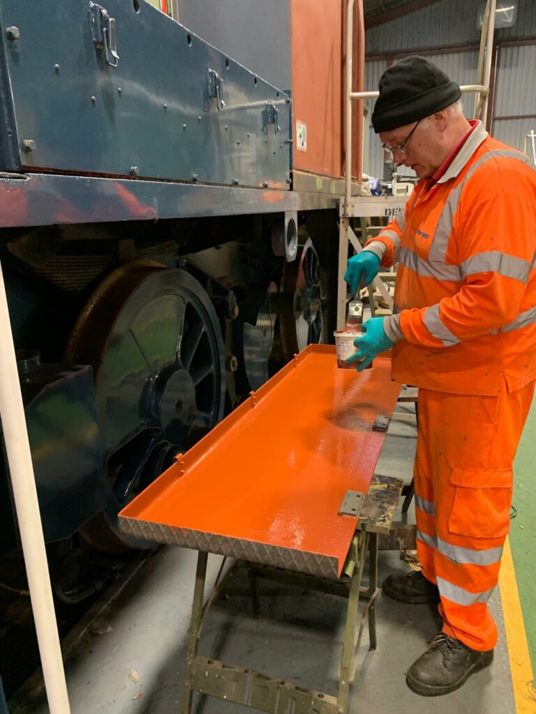 Class 14 ‘Teddy Bear’ D9518 – work continued on the electrical system re-wire and on the rebuild of the Paxman ‘Ventura’ 6YJXL engine that last served in sister loco D9526, and volunteer Andy P made good progress on painting the battery box lids. The full team will be back on D9518 once D9526 departs for Bishops Lydeard.