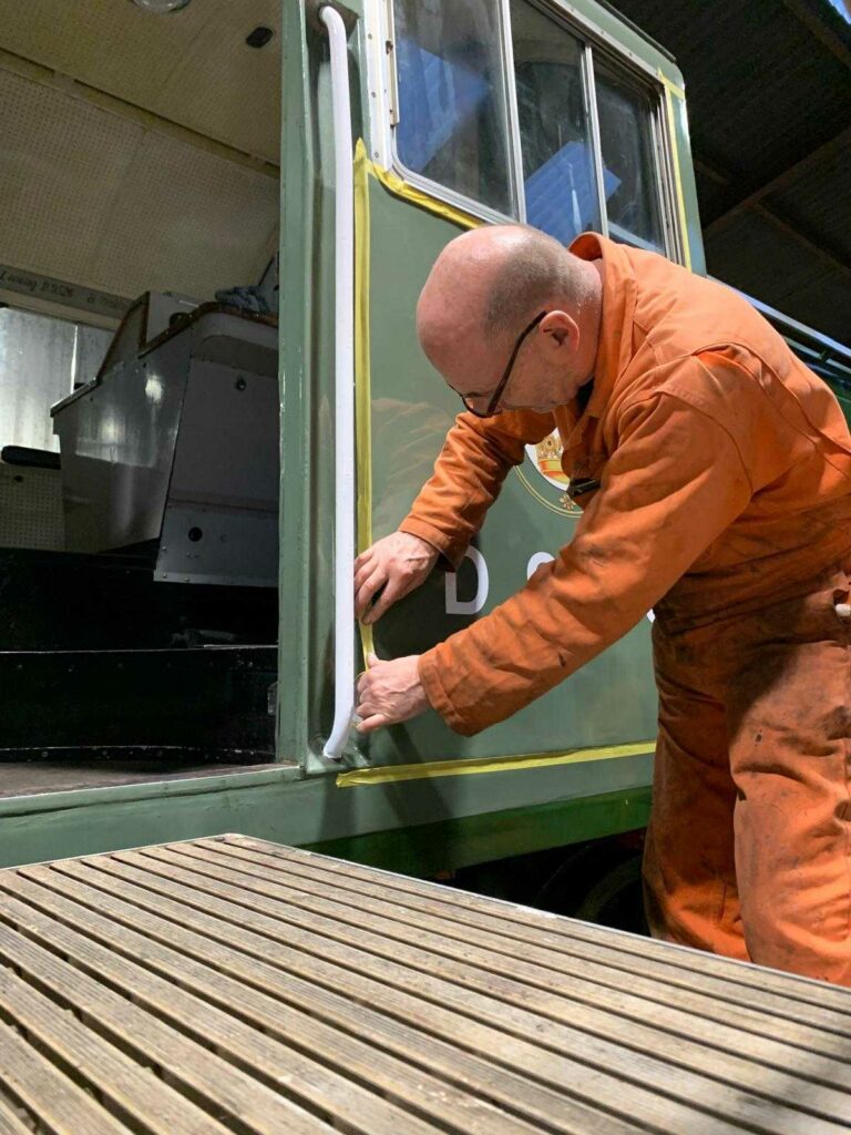 D9526 – careful preparations were being made by Colin G at Williton on Saturday 15th November 2025 before he applied a spray coat of varnish to the cabside transfers. Photo by Andy Royal © CC BY-NC 4.0