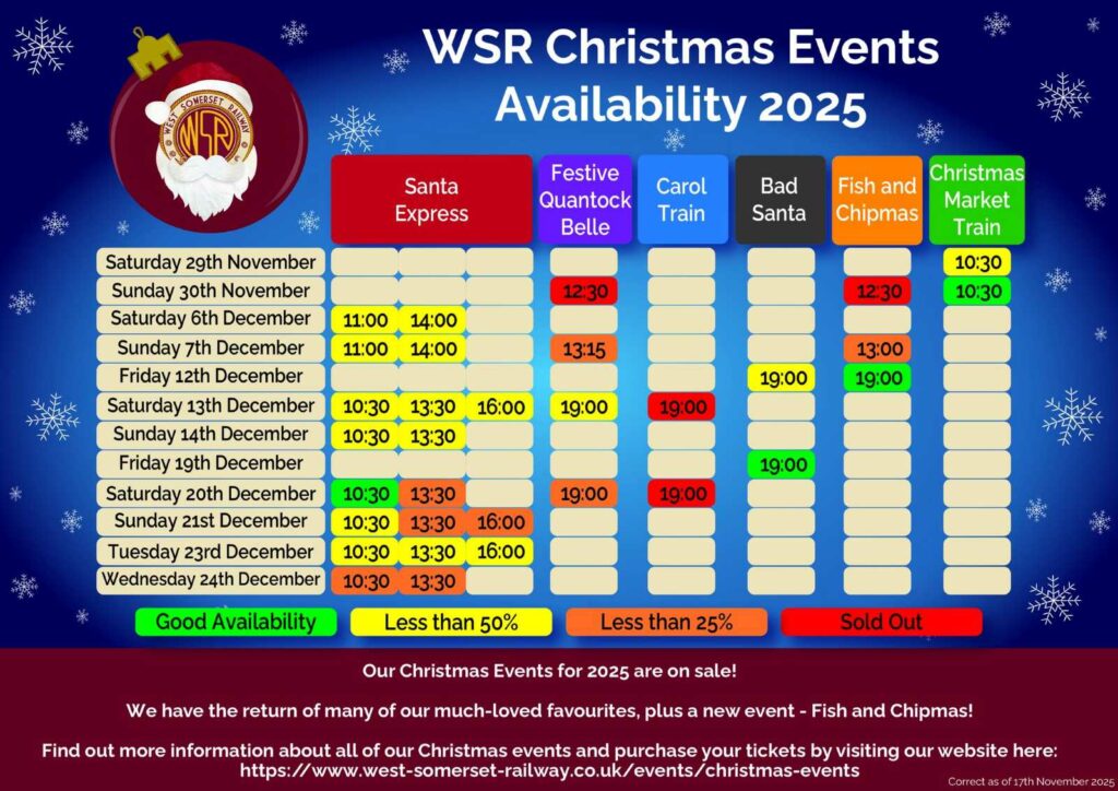 Back on the WSR, the Christmas Specials will be starting on Saturday 29th November, the kick-off being the MINEHEAD STATION CHRISTMAS MARKET SPECIAL that departs from Bishops Lydeard at 10:30 on Saturday 29th and Sunday 30th, returning from Minehead at 15:00 each day. The graphic below has been borrowed from the WSR’s Facebook page and gives a quick indication of some of the other specials that are on offer. Click here or on the graphic below to go to the WSR’s Christmas Events page: