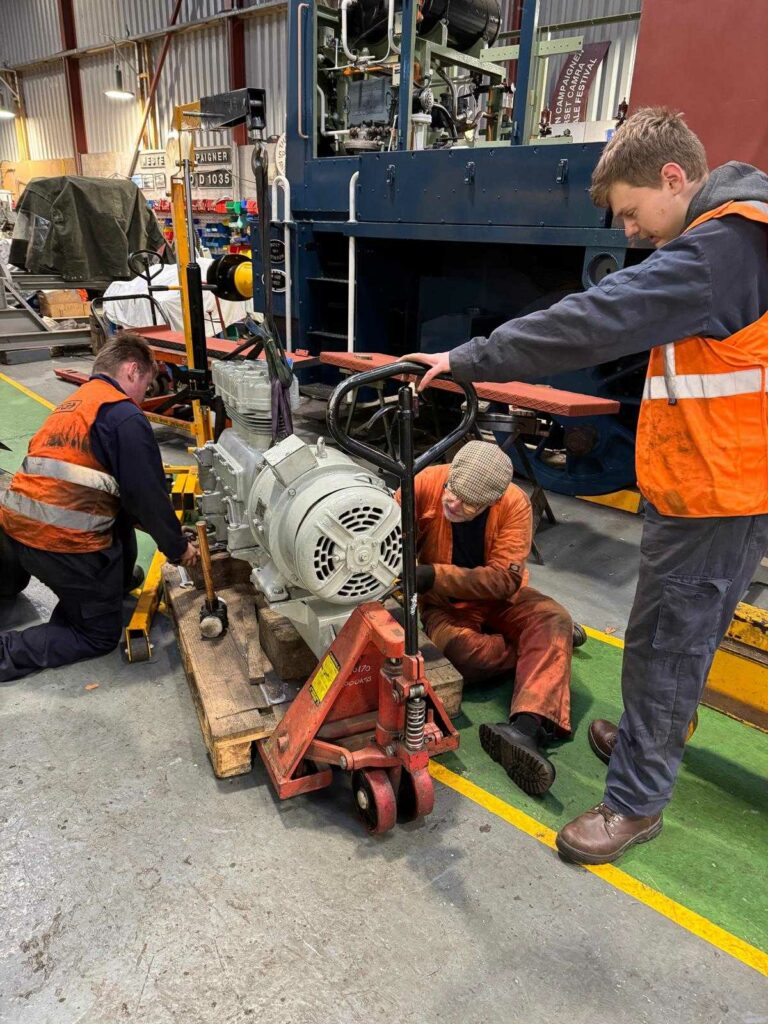 08401 (D3516) – the three main components of the Westinghouse vacuum exhauster were reassembled at Williton on Saturday 22nd November 2025, with volunteers (L-R) Ethan W, Neil C and Charlie heavily involved. Class 14 D9518 (NCB No. 7) dominates the background. Photo by Jon Tooke © CC BY-NC 4.0