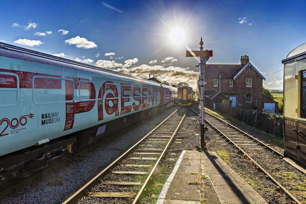 GWR Class 150 ‘Sprinter’ 150248 was pictured arriving at Bishops Lydeard with the ‘Inspiration’ exhibition train alongside, in the glorious autumn sunshine on Tuesday 25th November 2025. Photo by Mike Pinn © CC BY-NC 4.0