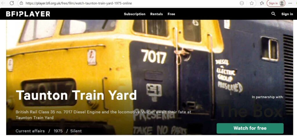 This 50-year-old film footage shows D7017 at Taunton some time between July 1975 and March 1976, waiting for the fledgling WSR to open and allow her to move to Minehead along with industrial steam locos ‘VICTOR’ and ‘VULCAN’. The move eventually took place on 26th March 1976. Video courtesy of the British Film Institute.