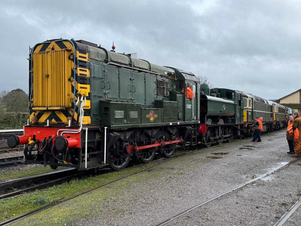 - Class 09 shunter D4107 (09019) ran ‘Light Engine’ from Bishops Lydeard to Williton where she then collected ex-GWR 0-6-0PT 6435 from the North Yard