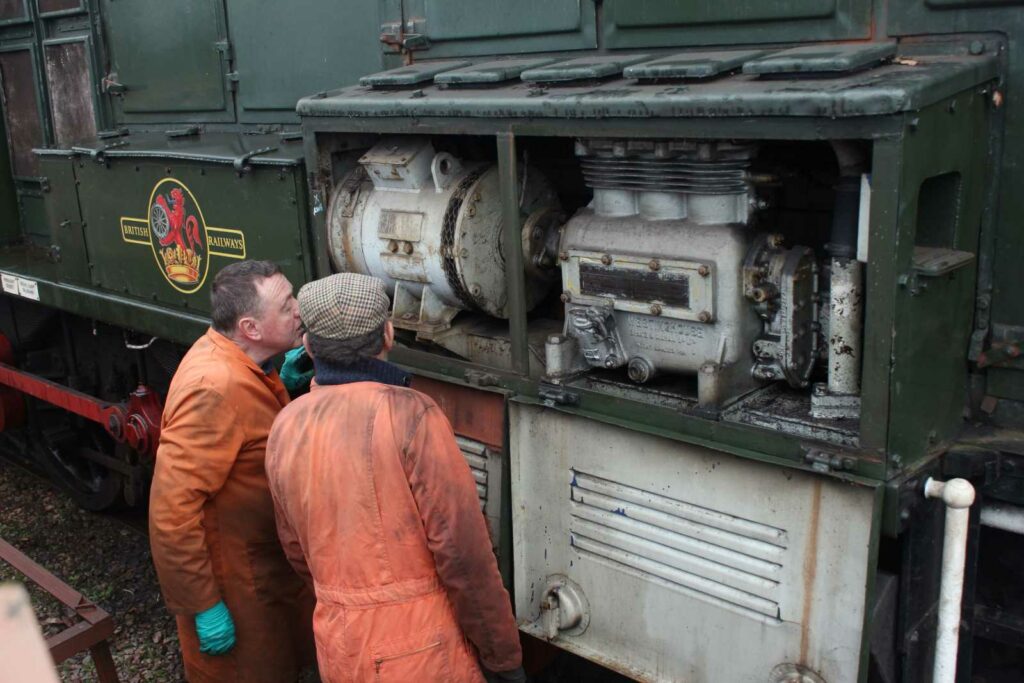 D4107 (09019) – Ian R and Neil C examine the Westinghouse vacuum exhauster installation to learn as much as they can before copying the installation over to 08401 (D3516). Photo by Jon Tooke © CC BY-NC 4.0