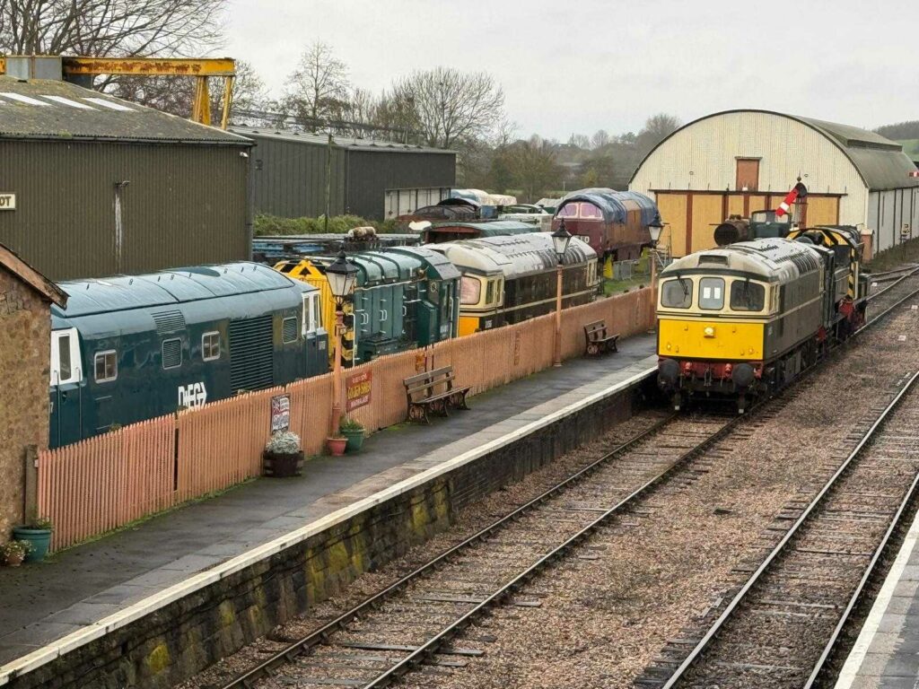 A show of force at Williton on Saturday 22nd November 2025 – left to right, Class 35 ‘Hymek’ D7017, Class 08 shunter 08401 (D3516), 33 ‘Crompton’ D6566 (33048), Class 52 D1010 ‘WESTERN CAMPAIGNER’, Class 33 ‘Crompton’ D6575 (33057), Barclay 0-4-0DH 578 (ROF 1), ex-GWR 0-6-0PT 6435 and finally Class 09 shunter D4107 (09019). The ’33’ and the Pannier Tank departed shortly afterwards for Bishops Lydeard, leaving the ’09’ at Williton. Photo by Jon Tooke © CC BY-NC 4.0