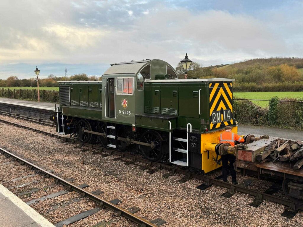 Class 14 ‘Teddy Bear’ D9526 was in charge of the ‘Tidy Train’ on Saturday 22nd November 2025 and was pictured at Williton Station after propelling the train from Dunster. The loco subsequently ran around the train and headed for Bishops Lydeard. Photo by Terry Deacon © CC BY-NC 4.0