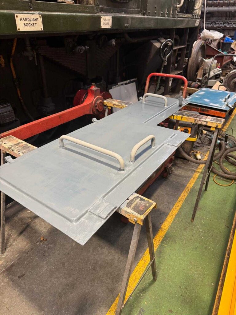 Class 14 ‘Teddy Bear’ D9518 – the two teams (Saturday and Tuesday) continue to push ahead with the work on this loco, with the Tuesday team concentrating on the engine and ancillary equipment, and the Saturday team concentrating on the bodywork. Some patient and diligent preparation was carried out by Andy P on one of the bodyside doors that was first retrieved from outdoor storage, and this door then received a coat of primer before home time. This door will be rubbed down again before getting several more coats of paint, to make sure that the finish is in-keeping with the rest of the loco. Well done Andy P !