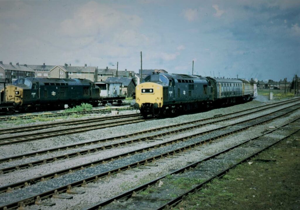 “40103 (D303) is captured in the summer of 1978 on the daily lunchtime empty vans train from Newcastle to York. This up train collected from the major Durham coast stations all the unloaded vans from that same early morning’s down parcels train. At Hartlepool, apart from the daily procession of 37s and Class 101 DMUs, this was the most interesting train of the day. The motive power could be absolutely anything, and could range from a Class 25 to a Class 55 that Gateshead depot were trying to get rid of. When a ’55’ was sighted it was always operating on one engine only because it was on it’s way to Doncaster Works for rectification.
