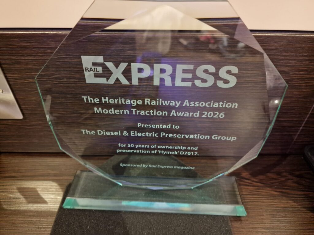 At the Heritage Railway Association (HRA) annual awards event on Saturday 7th March 2026, the DEPG were presented with the ‘RAIL EXPRESS MODERN TRACTION AWARD‘ by Editor Chris Milner (third from left) in recognition of 50 years of preservation of ‘Hymek’ D7017. The award was also presented to the Hastings Diesel Group (on the left) for their 30 years of mainline running. Centre stage, key fundraiser John Crane is holding the award for the DEPG with Martin Howard, Paul Tucker and Clive Burrows representing the multitude of dedicated volunteers who have looked after D7017 since acquisition in May of 1975. Photo by the HRA © CC BY-NC 4.0
