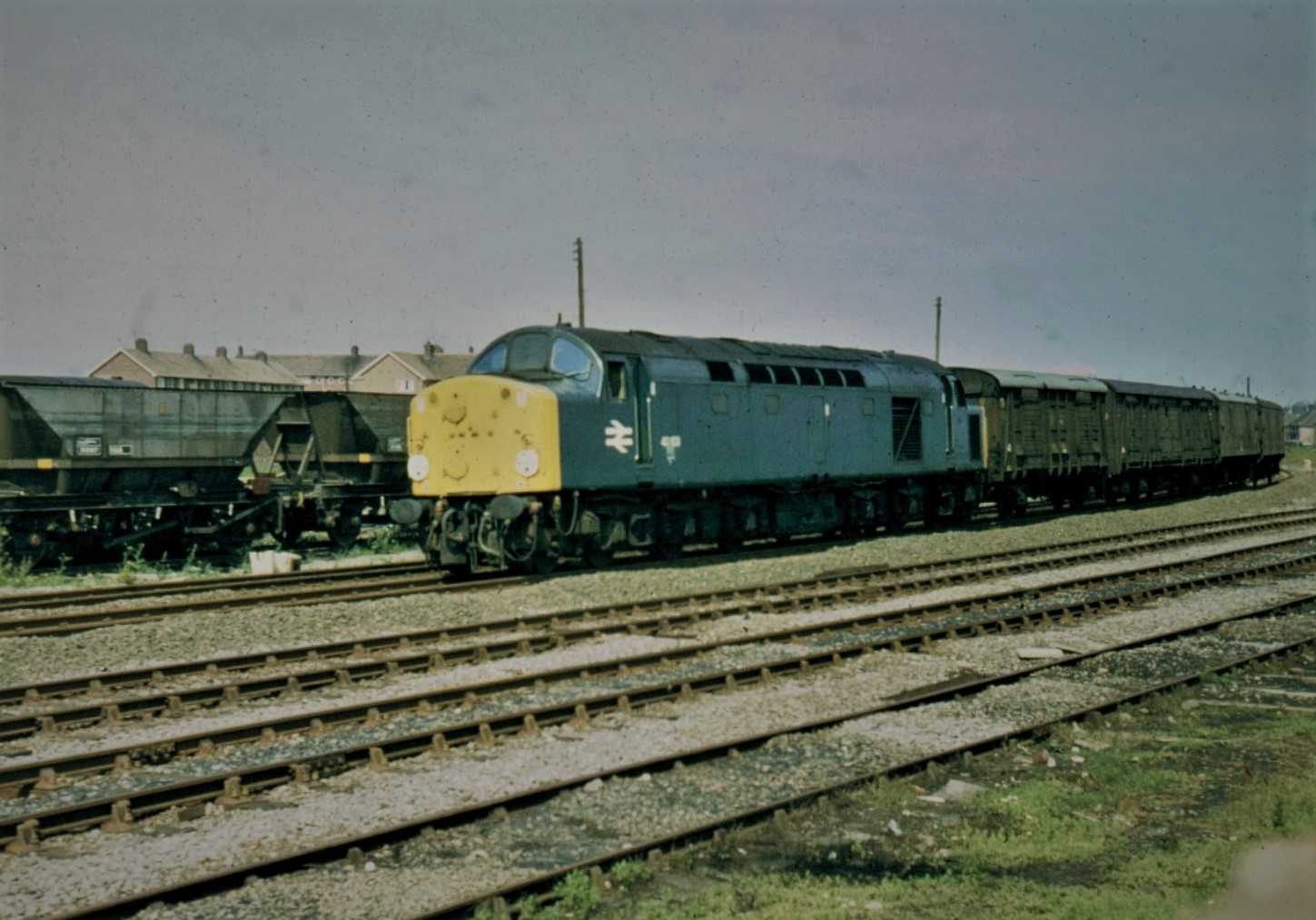“40103 (D303) is captured in the summer of 1978 on the daily lunchtime empty vans train from Newcastle to York. This up train collected from the major Durham coast stations all the unloaded vans from that same early morning’s down parcels train. At Hartlepool, apart from the daily procession of 37s and Class 101 DMUs, this was the most interesting train of the day. The motive power could be absolutely anything, and could range from a Class 25 to a Class 55 that Gateshead depot were trying to get rid of. When a ’55’ was sighted it was always operating on one engine only because it was on it’s way to Doncaster Works for rectification.