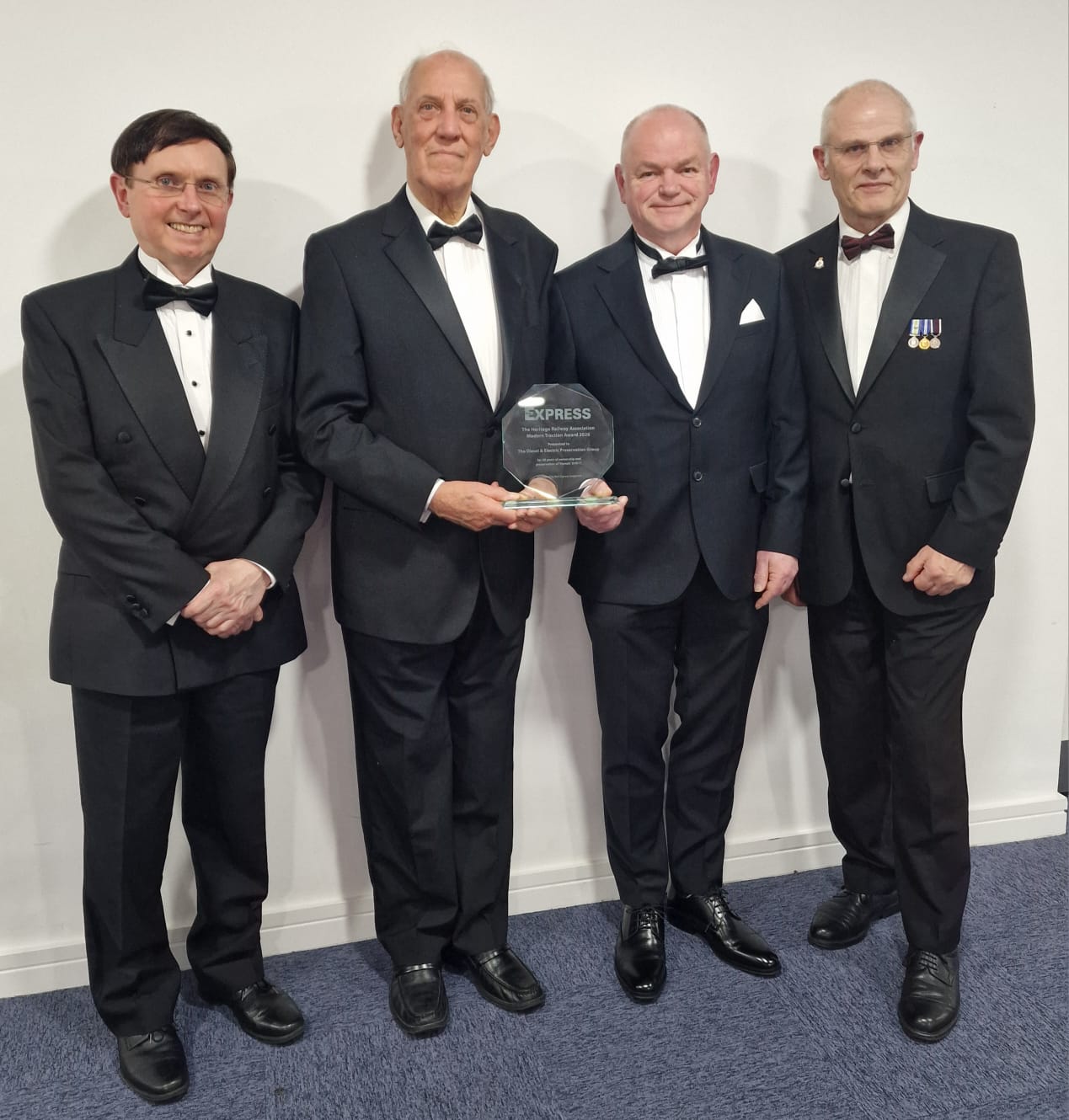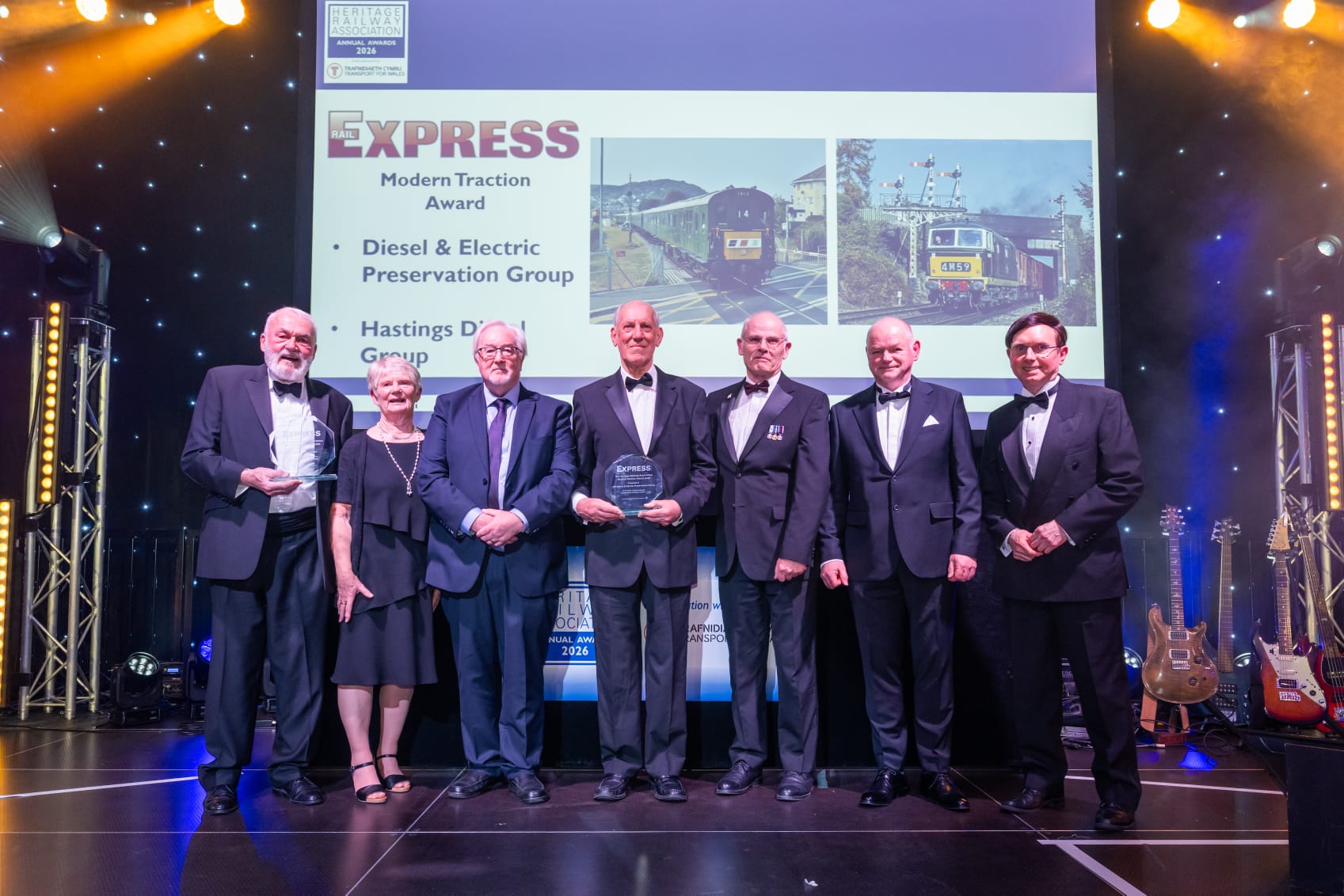 At the Heritage Railway Association (HRA) annual awards event on Saturday 7th March 2026, the DEPG were presented with the ‘RAIL EXPRESS MODERN TRACTION AWARD‘ by Editor Chris Milner (third from left) in recognition of 50 years of preservation of ‘Hymek’ D7017. The award was also presented to the Hastings Diesel Group (on the left) for their 30 years of mainline running. Centre stage, key fundraiser John Crane is holding the award for the DEPG with Martin Howard, Paul Tucker and Clive Burrows representing the multitude of dedicated volunteers who have looked after D7017 since acquisition in May of 1975. Photo by the HRA © CC BY-NC 4.0