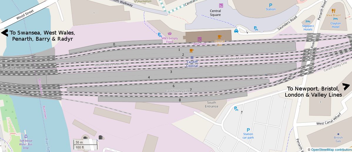 Today’s plan view of Cardiff Central Station differs only in the addition of Platforms 0 and 8, but has changed beyond all recognition in terms of surroundings, as the city has grown up around it and low-level dwellings have been swept away and replaced by hi-rise hotels. All through roads are now electrified. Image by OpenSteetMaps © CC BY-NC 4.0