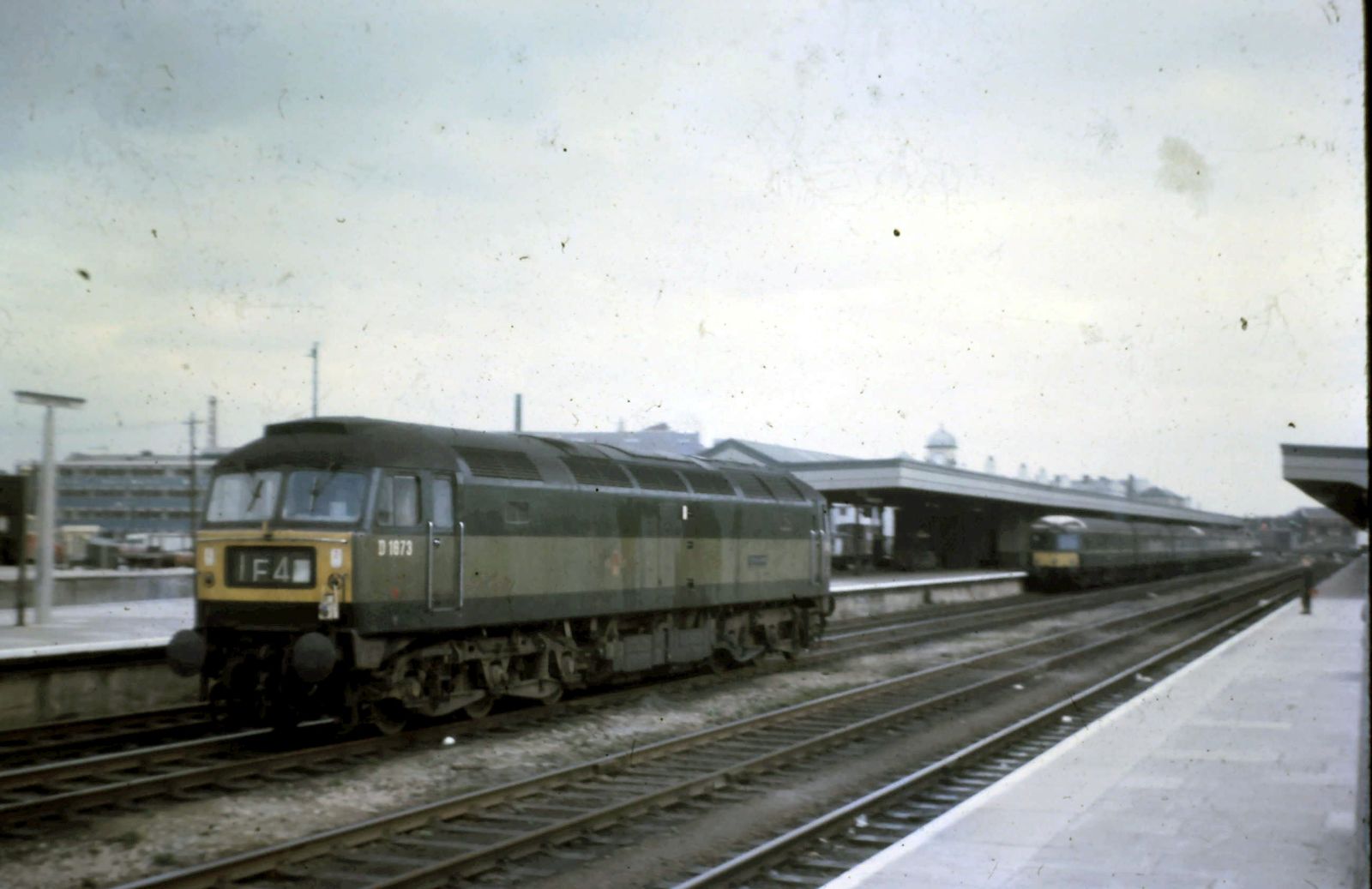 The first image is looking across to platforms 1 and 2 which are the ‘up’ platforms (heading East), and a 6-car Swindon-built Class 120 ‘Cross-Country’ DMU can be seen at Platform 2, most likely destined for Birmingham Snow Hill. Taking the up relief line through the station is Class 47 D1673 (47087, 47624) ‘CYCLOPS’ running light engine. This sets the date as AFTER June 1966 because ‘CYCLOPS‘ was named in that month and her nameplate is visible in this image.
