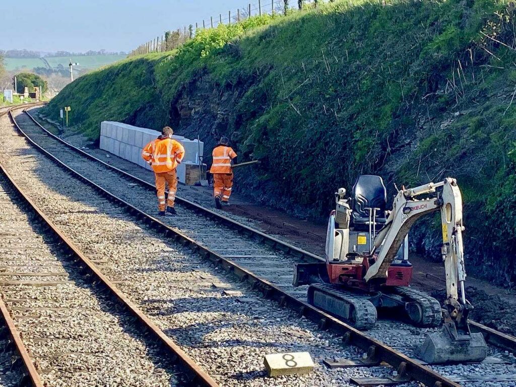 A concrete retaining wall has been constructed to protect the line, following a minor landslip that occurred during the very wet weather in February. Pictured at Blue Anchor on Thursday 19th March 2026 by Robin Wichard © CC BY-NC 4.0