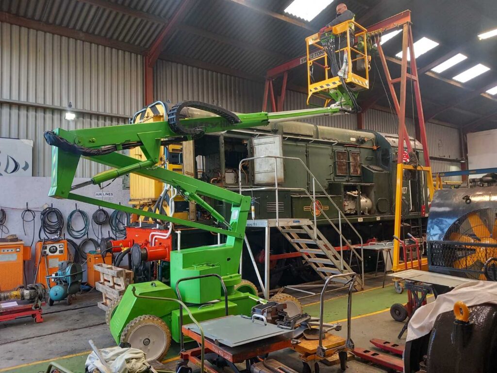 DEPG NEWS: our recently-restored ‘NiftyLift’ Mobile Elevating Work Platform (MEWP or ‘Cherry Picker’ in common parlance) gained it’s LOLER (Lifting Operations and Lifting Equipment Regulations 1998) certificate earlier this week and was immediately put to use by our insurance assessor to inspect the 2 tonne gantry crane in the loco shed. The restoration of this 2001-vintage machine is the result of many hours of patient work by Tony, Gwyn, JT and several others, who have together managed to bring this machine back from near-total dilapidation to the fully working and certificated machine that we see today. WELL DONE TEAM!