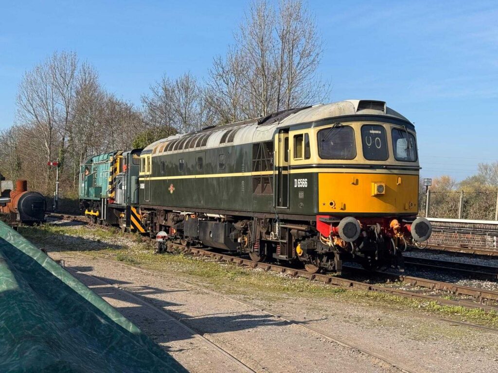 D6566 (33048) – this loco was shunted from outdoors on No. 1 road to indoors on No. 2 road by Class 08 shunter 08401 (D3516) at Williton on Saturday 21st March 2026. Barclay 0-4-0DH 578 (ROF1) is sandwiched between the ’08’ and the ’33’. Photo by Jon Tooke © CC BY-NC 4.0