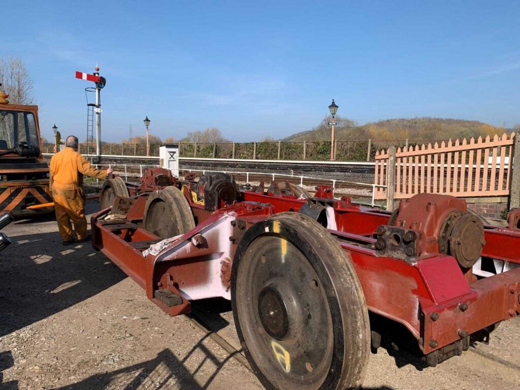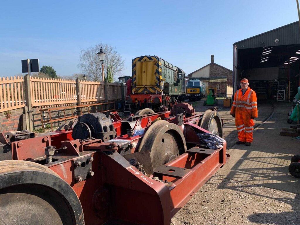 D1010 – the set of four equalising beams and pedestals from the primary suspension of the ‘A’ and ‘B’ bogies were undergoing refurbishment at the workshops of subcontractor MATT HIGHAM on Saturday 21st March 2026. We expect to get a pair of these major assemblies back into the ‘B’ bogie during the first week of April. Photo by Matt Higham © CC BY-NC 4.0