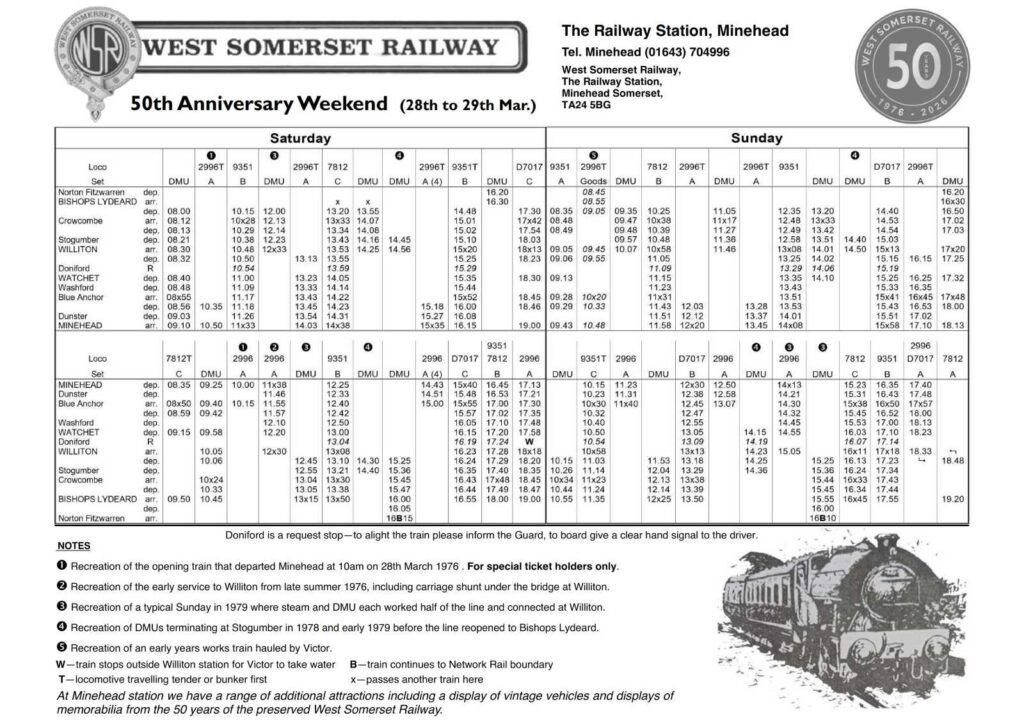THIS WEEKEND – Bagnall 2996 ‘VICTOR’ leads the celebrations and ‘Hymek’ D7017 (also present at Minehead on the day of the re-opening back in 1976) will be working public services on Saturday 28th and Sunday 29th March 2026. Click here for details.